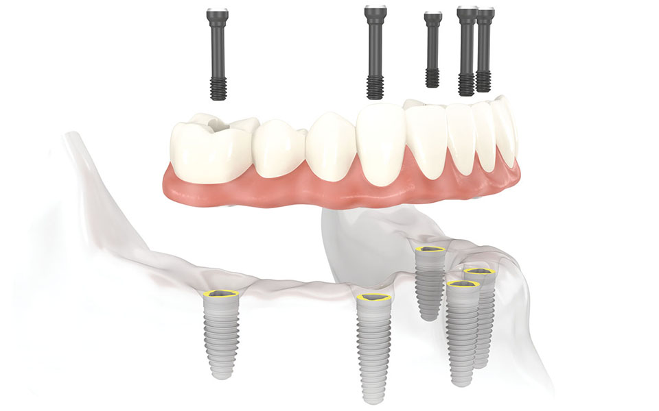 Le concept thérapeutique All-on-4 / All-on-6 remplace les dents manquantes par un bridge complet soutenu uniquement par quatre ou six implants dentaires. Etant donné le nombre limité d’implants nécessaires, la durée totale du traitement est réduite.